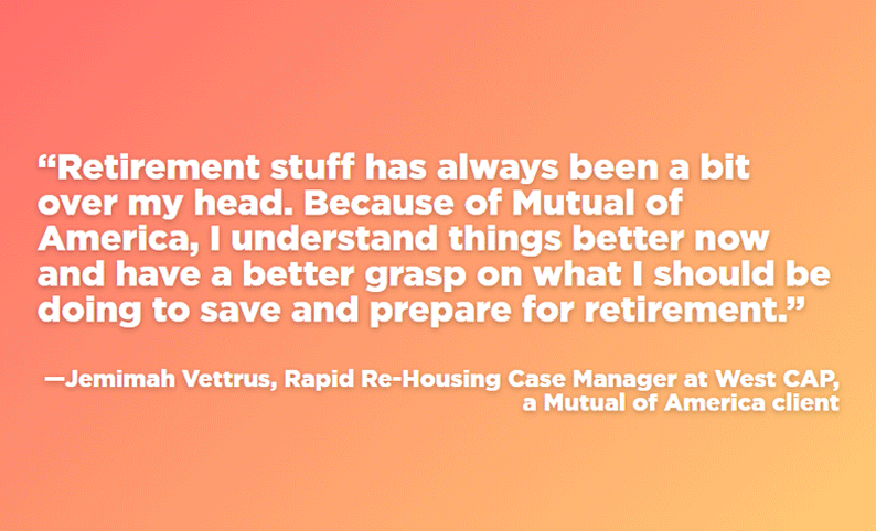 The statement made in this publication is by a client of Mutual of America and is not a paid testimonial. This testimonial may not be representative of the experience of other clients and is not indicative of future performance or success.